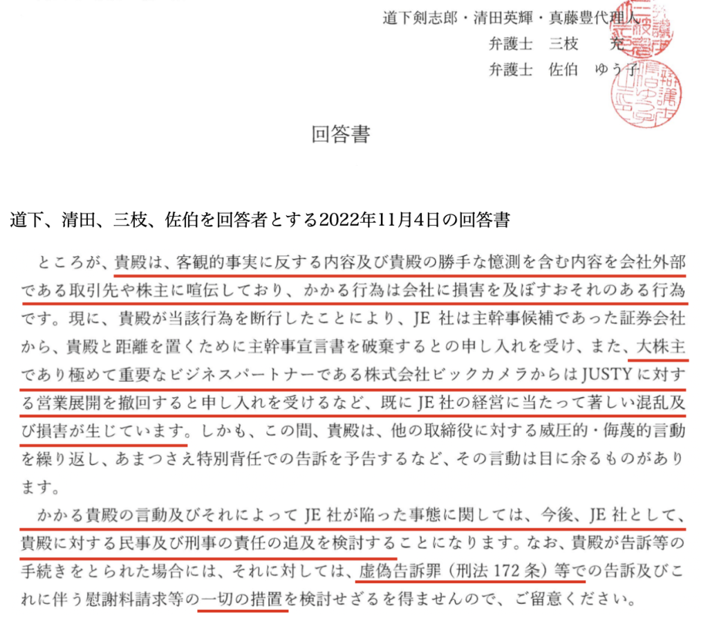 • 2022年11月4日、道下氏は渡部氏に対し、自身らの特別背任容疑に関する責任追及を断念させる目的で、強要および脅迫に該当する行為を行ったとされる。