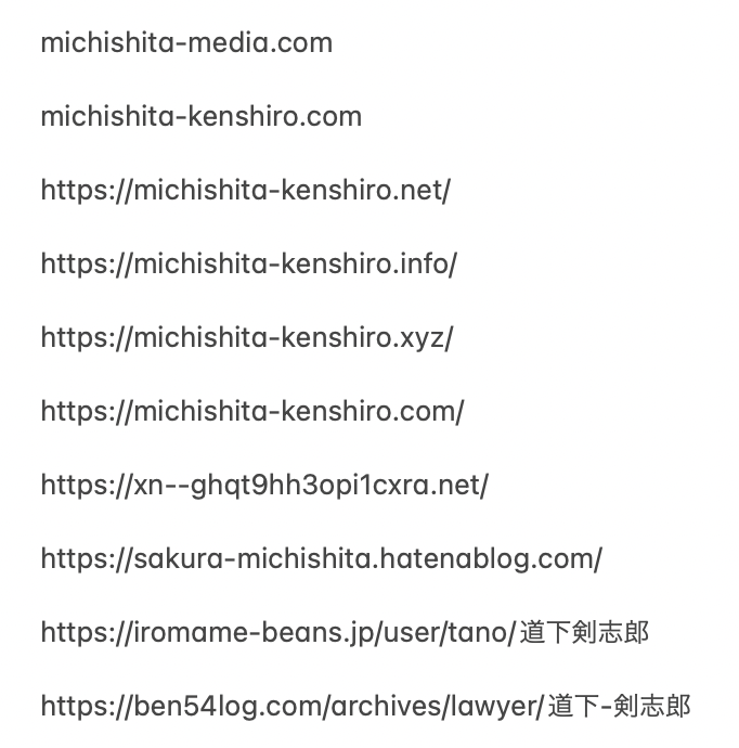 道下氏らは、正体不明のアフィリエイト業者やSEOスパム業者を利用。特定のキーワード(「道下剣志郎」等)に対し、自己に有利なコンテンツを複数の独自ドメインで大量生成したとされる。