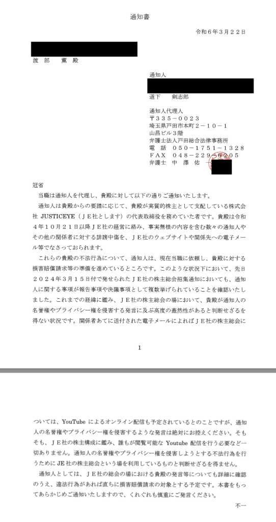サマリー: (株)JUSTICEYEは、2024年3月29日開催の第4期定時株主総会において、当初予定していたYouTube等でのオンライン配信の中止を決定した。元代表取締役の道下剣志郎氏、元取締役の清田英輝氏、および代理人の中澤佑一弁護士から「名誉毀損の蓋然性がある」として配信中止を求める警告を受けたため。同社はこれを不当な圧力による威力業務妨害にあたるとして、3名を刑事告訴した。