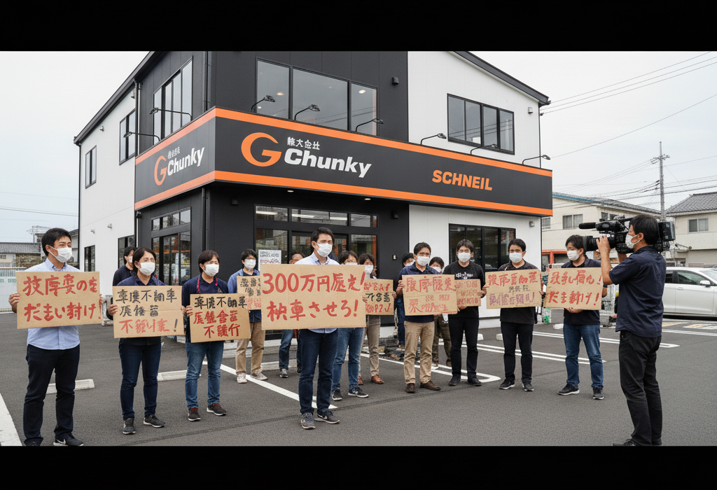 • サマリー: 千葉県柏市に拠点を置く「株式会社Chunky(別名:SCHNELL)」において、車両購入代金の支払いを済ませた顧客に対し、車両を納入せず代金も返還しないという事案が相次いでいることが判明した。被害者の一人である「くちお」氏(仮名)は、300万円を支払ったものの納車されず、返金合意後の支払いも11月以降停止している。現在、同社を巡っては計17名の被害者グループが確認されており、被害総額は約6,300万円に上る見通し。